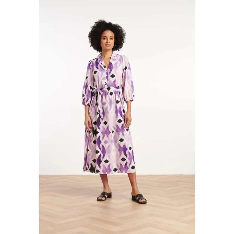 Ga voor een opvallende en stijlvolle look met deze lange jurk van Smashed Lemon. De jurk is voorzien van een vrolijke abstracte print in de levendige kleuren wit en paars, die elke outfit een frisse en moderne uitstraling geeft. Met de losvallende pasvorm biedt de jurk comfort, terwijl het ceintuur in de taille zorgt voor een mooi vrouwelijk silhouet. Deze elegante jurk heeft driekwart mouwen en een kraag met knoopsluiting tot aan de taille, waardoor je zelf kunt bepalen hoe formeel of casual je de look maakt. Of je nu kiest voor een dagelijkse outfit of een speciale gelegenheid, deze Smashed Lemon jurk biedt veelzijdigheid en een frisse touch aan je garderobe. Kenmerken: - Vrolijke abstracte print in wit en paars voor een speelse, moderne uitstraling - Losvallend model met ceintuur voor een vrouwelijke pasvorm - Kraag met knoopsluiting tot aan de taille voor een verfijnde lookSpecificaties : * Stijl: jurken * Print: Abstract * Pasvorm: Losvallend * Lengte: Maxi * Model: