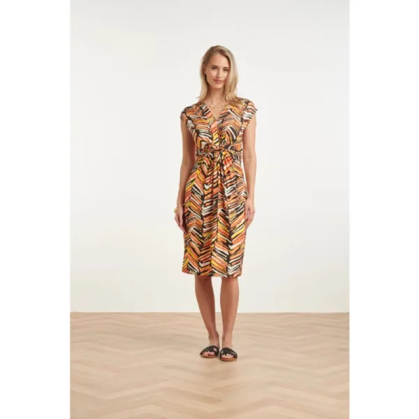 Laat je persoonlijkheid stralen met dit levendige en stijlvolle jurkje van Smashed Lemon, perfect voor elke gelegenheid waar je wilt opvallen! Dit jurkje combineert een opvallende print met een flatterende pasvorm, ideaal voor zowel een casual dag als een feestelijke avond. Het jurkje is voorzien van een dynamische en kleurrijke abstracte print in tinten van oranje, geel, zwart en wit, wat zorgt voor een energieke uitstraling. De elegante V-halslijn benadrukt het decolleté op een subtiele wijze. Het ontwerp heeft een slim geplaatste plooien in de taille, die een prachtig zandloperfiguur creëren en eventuele oneffenheden camoufleren. De comfortabele pasvorm en de soepele stof zorgen ervoor dat het jurkje heerlijk draagt en je de hele dag comfortabel blijft. Dit jurkje is de perfecte keuze voor een zomerse bruiloft, een avondje uit, of gewoon om je dagelijkse look op te fleuren! Productkenmerken: Levendige Abstracte Print: Een uniek en energiek patroon dat de aandacht trekt. Flatterende