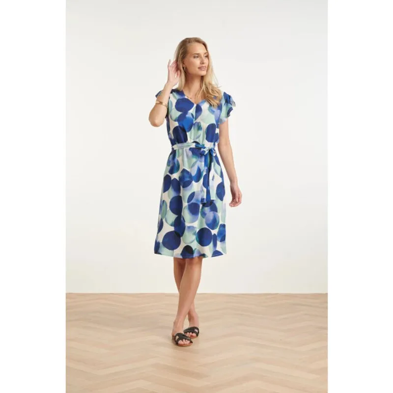 Duik de zomer in met dit vrolijke en stijlvolle jurkje, een perfecte toevoeging aan je garderobe! Dit jurkje combineert een speelse print met een comfortabele pasvorm, ideaal voor zonnige dagen en luchtige avonden. Het jurkje is voorzien van een dynamische en levendige polkadot print in diverse blauw- en groentinten op een lichte achtergrond, wat zorgt voor een frisse en opvallende uitstraling. De elegante V-halslijn benadrukt het decolleté op een subtiele wijze, terwijl de korte mouwen zorgen voor een luchtig gevoel. De jurk heeft een strikceintuur in de taille, waarmee je het silhouet naar wens kunt aanpassen en een vrouwelijke touch kunt toevoegen. De soepele stof zorgt ervoor dat het jurkje heerlijk draagt en je de hele dag comfortabel blijft. Dit jurkje is de perfecte keuze voor een dagje uit, een zomerse lunch of een gezellige borrel. Productkenmerken: Levendige Polkadot Print: Een speels en kleurrijk patroon dat de aandacht trekt. Aanpasbare Strikceintuur: Benadrukt de taille en