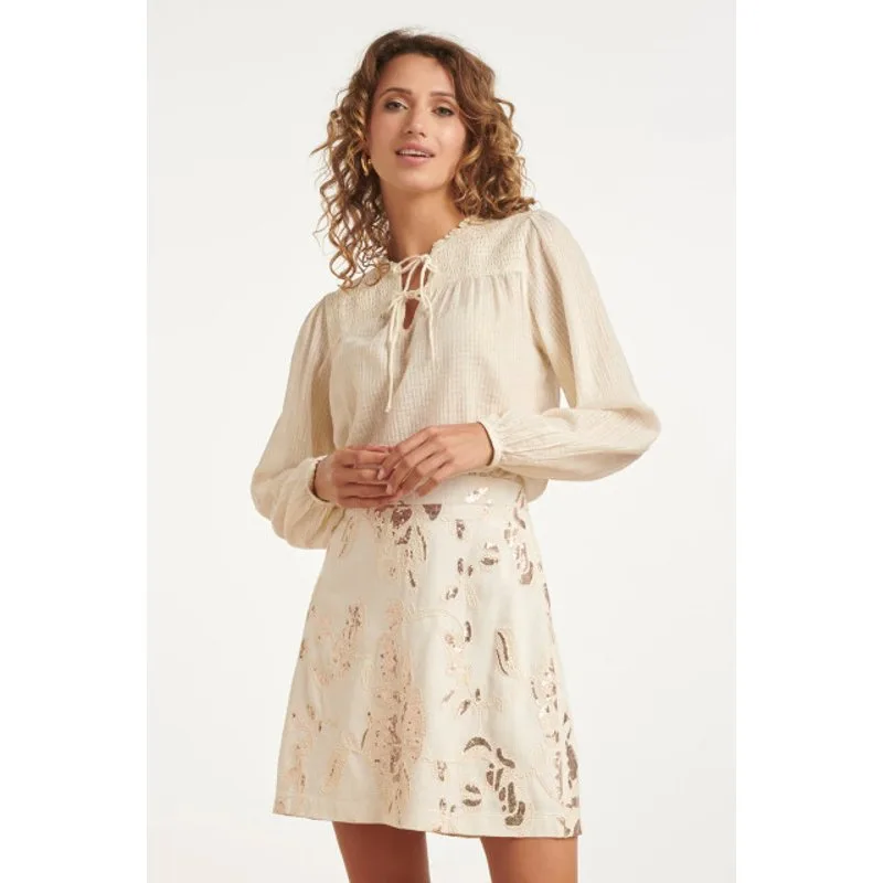 Smashed Lemon Crème blouse met gesmokte details en boho rijgsluiting |