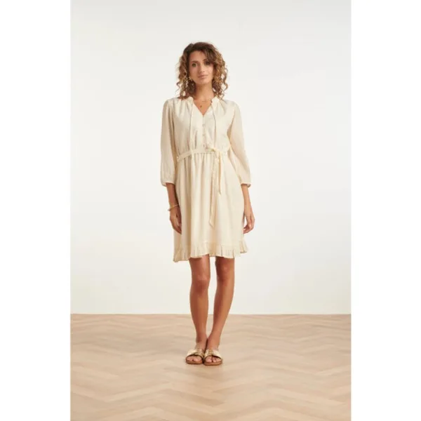 Ben je op zoek naar de perfecte combinatie van elegantie en comfort? Deze prachtige crèmevitte jurk van Smashed Lemon is een absolute must-have voor je zomergarderobe. De jurk is vervaardigd van een luchtige stof met een subtiele textuur, waardoor hij heerlijk draagt op warme dagen. De verfijnde ruches langs de kraag en de knoopsluiting geven het item een romantische touch, terwijl de bijpassende strikceintuur je taille prachtig accentueert. Of je nu naar een tuinfeest gaat of een dagje de stad in trekt, met deze jurk van Smashed Lemon zie je er altijd stijlvol uit. Belangrijke kenmerken: Vervaardigd van luchtige, getextureerde stof voor optimaal draagcomfort. Vrouwelijke pasvorm met een accentuerende strikceintuur in de taille. Stijlvolle afwerking met romantische ruches en een subtiele knoopsluiting.Specificaties : * Stijl: Jurken * Print: Uni * Pasvorm: Losvallend * Lengte: Boven de knie * Model is: 174cm tall and wears size S/36 * Country of origin:: Made in India *