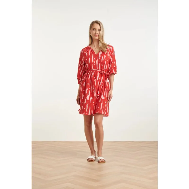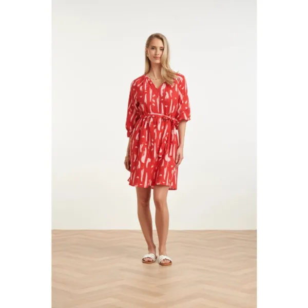 Stap stijlvol de dag in met deze prachtige rode jurk van Smashed Lemon. Deze jurk valt direct op door de artistieke abstracte print, waarbij krachtig rood wordt gecombineerd met zachte roze accenten. Het model is voorzien van een elegante V-hals en driekwart mouwen met elastische boorden, wat zorgt voor een speelse en vrouwelijke uitstraling. Dankzij het bijbehorende strikceintuur in de taille kun je de pasvorm van deze Smashed Lemon jurk naar wens accentueren voor een vrouwelijk silhouet. De stof heeft een subtiele structuur (crêpe-look) die niet alleen luxe aanvoelt, maar ook heerlijk luchtig draagt. Of je nu een lunchafspraak hebt of een dagje naar kantoor gaat, met deze jurk maak je altijd een modieus statement. Belangrijke kenmerken: Voorzien van een unieke abstracte print in rood en roze. Inclusief bijpassend strikceintuur om de taille te accentueren. Luchtige stof met een lichte textuur voor optimaal draagcomfort.Specificaties : * Stijl: Jurken * Print: Abstract *