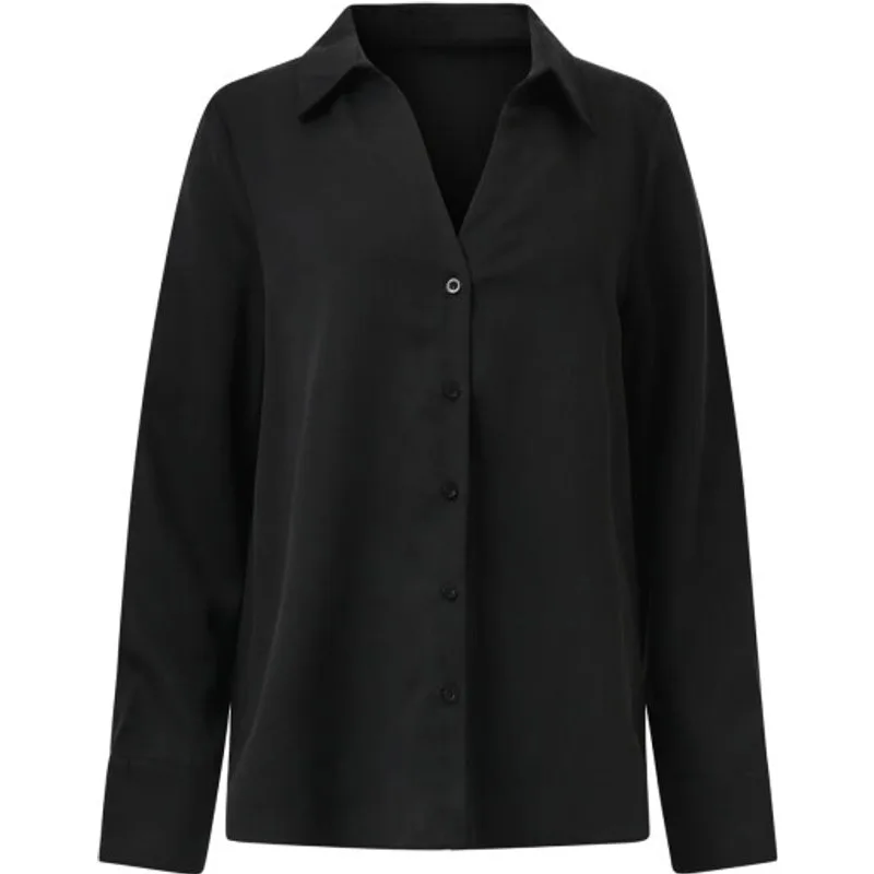 De zwarte blouse van Smashed Lemon is een stijlvol en veelzijdig kledingstuk, gemaakt van 100% Tencel. Dankzij het doorknoopmodel met V-hals en klassieke kraag oogt de blouse vrouwelijk en modern. De losvallende pasvorm en korte lengte maken het perfect te dragen op een high-waisted broek, rok of short. Combineer deze tijdloze top moeiteloos van casual tot chic. Belangrijkste kenmerken: - Effen zwart: klassiek, stijlvol en makkelijk te combineren - Doorknoopmodel met V-hals en kraag - Gemaakt van 100% Tencel: duurzaam, ademend en zijdezacht - Losvallend en kort model voor moderne styling - Ideaal voor dagelijks gebruik of kantoor Verkrijgbaar in white, red, black.Specificaties : * Stijl: Tops * Print: Uni * Pasvorm: Losvallend * Lengte: Kort * Model is: 175 cm tall and wears size S/36 * Country of origin: Made in P.R.C. * Verkrijgbaar in kleuren: Wit, Rood, Zwart * Lining: No * Fabric composition: 100% Tencel