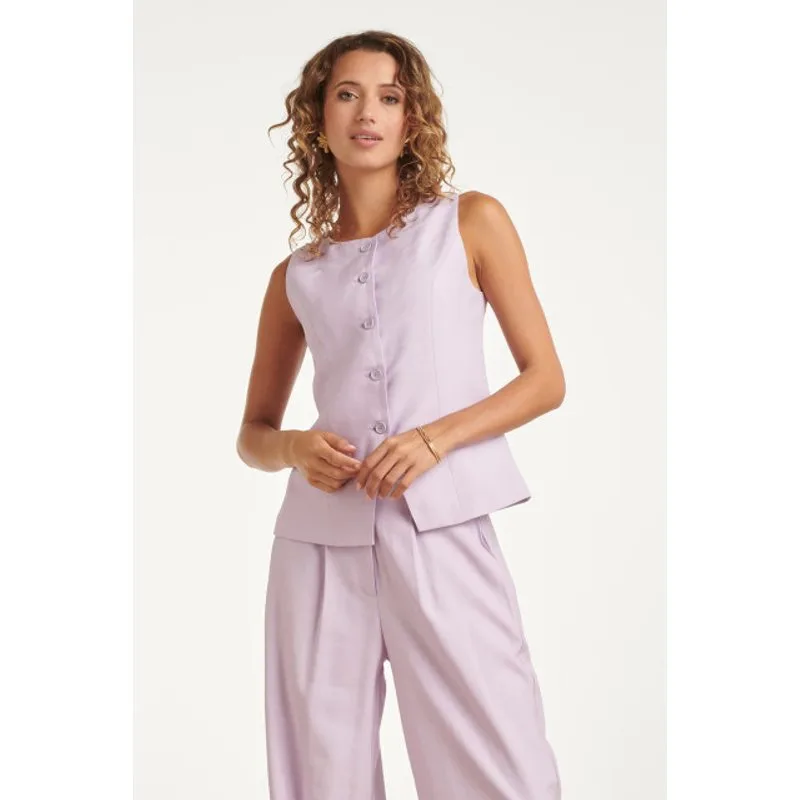 Dit mouwloze gilet van Smashed Lemon is dé trend van dit seizoen en biedt eindeloze variatiemogelijkheden. Het gilet heeft een nette, ronde halslijn en een volledige knoopsluiting aan de voorzijde, wat zorgt voor een minimalistische en chique uitstraling. Aan de onderzijde loopt het gilet speels uit in een lichte split, terwijl de paspeltasjes aan de voorzijde zorgen voor een klassiek detail. Draag dit gilet van Smashed Lemon als een top op een wijde broek of gelaagd over een blouse voor een geraffineerde look. Belangrijkste kenmerken : Verfijnde knoopsluiting aan de voorzijde en een nette ronde hals. Voorzien van klassieke paspelzakken voor een luxe afwerking. Gemaakt van een soepele stof die prachtig langs het lichaam valt.Specificaties : * Stijl: Gilet * Print: Uni * Pasvorm: Getailleerd * Lengte: Kort * Model is: 174cm tall and wears size S/36 * Country of origin:: Made in P.R.C. * Verkrijgbaar in kleuren: Lila, Beige * Lining: 100% Viscose lining * Fabric