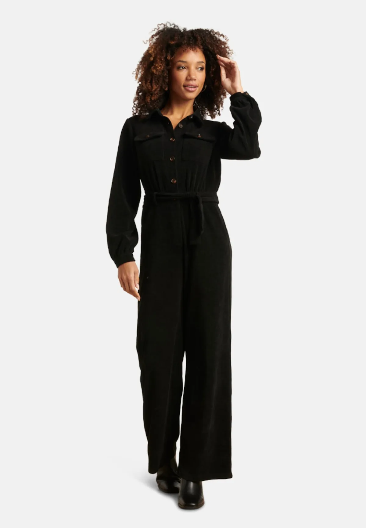 Zwarte jumpsuit van Smashed Lemon, uitgevoerd in zachte corduroy met een klassieke overhemdkraag, lange mouwen en een knoopsluiting over de borst. De wijde, uitlopende pijpen creëren een flatterend silhouet dat comfortabel zit én stijl uitstraalt. De diepe zwarte kleur maakt het een veelzijdige keuze voor zowel dagelijkse looks als meer geklede momenten. Combineer met laarzen of hakken en voeg een statement riem toe voor extra accent op de taille. Belangrijkste kenmerken: - Zwarte corduroy met verfijnde ribstructuur - Overhemdmodel met kraag en knopen voor een klassieke touch - Uitlopende pijpen voor een elegante, vrouwelijke uitstraling - Lange mouwen, ideaal voor koelere dagen Verkrijgbaar in Bordeaux, black.Specificaties : * Stijl: Jumpsuits * Print: Uni * Pasvorm: Uitlopend * Lengte: Lang * Model is: 173 cm tall and wears size S/36 * Country of origin: Made in P.R.C. * Verkrijgbaar in kleuren: Bordeaux, Zwart * Lining: No * Fabric composition: 68% Euro lint 29%