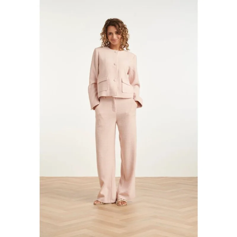 Ga voor een tijdloze en chique look met deze stijlvolle korte blazer van Smashed Lemon. De blazer is vervaardigd van een rijke bouclé-achtige stof die direct doet denken aan de klassieke couture-stijl. De ronde halslijn en de grote opgestikte zakken aan de voorzijde geven het jasje een moderne update. Of je deze Smashed Lemon blazer nu dichtgeknoopt draagt op een pantalon of open over een top, je bent verzekerd van een modieuze en zelfverzekerde verschijning. Belangrijkste kenmerken : Luxe bouclé textuur voor een klassieke couture uitstraling Elegant kort model met een verfijnde ronde halslijn Voorzien van stijlvolle opgestikte zakken en grote knopenSpecificaties : * Stijl: Jasje * Print: Uni * Pasvorm: Getailleerd * Lengte: Kort * Model is: 174cm tall and wears size S/36 * Country of origin:: Made in P.R.C. * Verkrijgbaar in kleuren: Wit, Roze * Lining: 100% Polyester lining * Fabric composition: 100%polyester