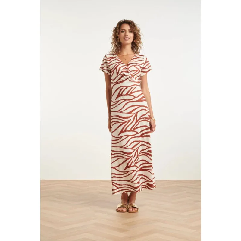 Kies voor een tijdloze uitstraling met deze maxi-jurk van Smashed Lemon. De jurk heeft een klassieke bruin-witte zebra-style print en korte kapmouwen. Het overslagmodel zorgt voor een prachtig decolleté en een flatterende pasvorm voor elk figuur. Belangrijkste kenmerken: Stijlvolle maxi-lengte die zorgt voor een elegante verschijning. Klassieke zebra-style print in een natuurlijke bruine kleurstelling. Flatterend overslagmodel dat de natuurlijke vormen prachtig volgt.Specificaties : * Stijl: Jurken * Print: Dieren * Pasvorm: Uitlopend * Lengte: Midi * Model is: 174cm tall and wears size S/36 * Country of origin:: Made in P.R.C. * Verkrijgbaar in kleuren: Brique - Gebroken wit * Lining: No * Fabric composition: 95%polyester,5%spandex