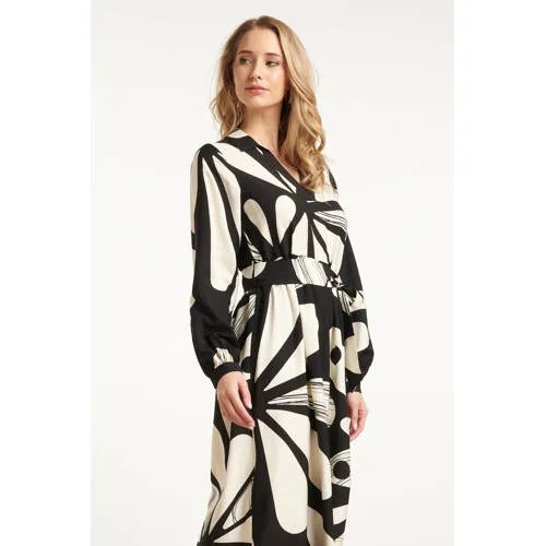 Deze elegante maxi-jurk van Smashed Lemon is uitgevoerd in een verfijnde bloemenprint in off-white op een zwarte achtergrond. De jurk heeft een vrouwelijk panelen lijfje met een V-hals en klassieke kraag, afgewerkt met lange pofmouwen met manchetten en een bijpassende tailleceintuur voor een flatterend silhouet. Gemaakt van een luchtige rayonstof (80%) die zacht aanvoelt en sierlijk meebeweegt. Belangrijke punten: • Romantische bloemenprint in zwart en off-white • Panelen V-hals met kraag, pofmouwen en bijpassende ceintuur voor een elegante look • Gemaakt van 80% rayon – licht, ademend en comfortabel voor elke gelegenheidSpecificaties : * Stijl: Jurken * Print: Bloemen * Pasvorm: Losvallend * Lengte: Maxi * Model is: 176 cm tall and wears size S/36 * Country of origin: Made in P.R.C. * Kleur: Black-Off white * Lining: No * Fabric composition: 80%Rayon 20%Nylon