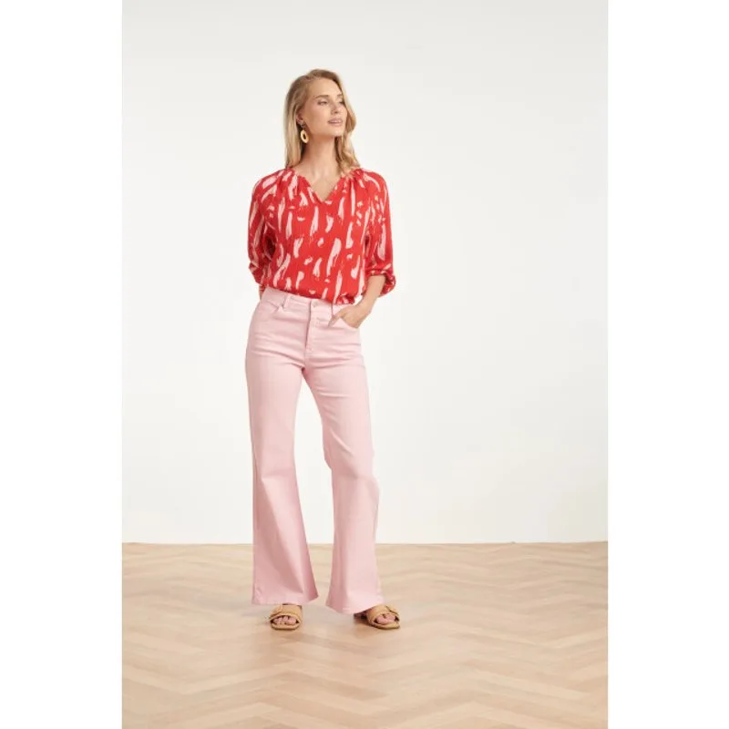 Deze vrolijke top van Smashed Lemon is de perfecte aanvulling op je voorjaars- of zomercollectie. De top is uitgevoerd in een levendige rode kleur met een contrasterende roze print die doet denken aan moderne penseelstreken. De subtiele V-hals en de comfortabele pasvorm maken dit item van Smashed Lemon zowel modieus als praktisch. De mouwen zijn driekwart lang en afgewerkt met elastiek, waardoor je ze gemakkelijk iets kunt opstropen voor een nonchalante look. Combineer deze Smashed Lemon top met een nette witte pantalon of een stoere jeans voor een complete outfit die overal bij past. De zachte, gestructureerde stof kreukt nauwelijks, ideaal voor een drukke dag. Belangrijke kenmerken: Opvallende abstracte print in een trendy kleurencombinatie. Vrouwelijke V-hals en driekwart mouwen met elastische manchetten. Vervaardigd van een soepele, licht gestructureerde stof.Specificaties : * Stijl: Tops * Print: Abstract * Pasvorm: Losvallend * Lengte: Kort * Model is: 176cm tall and