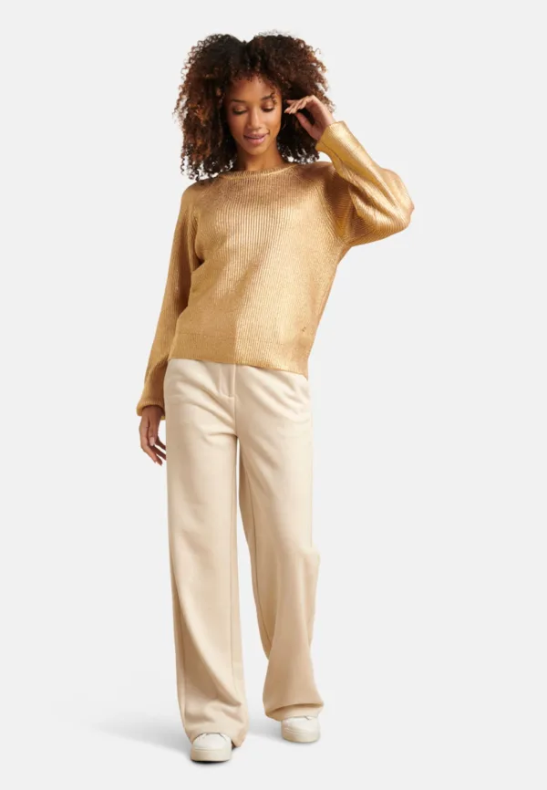 Geef je outfit een stralende upgrade met deze gebreide gouden top van Smashed Lemon. Dankzij de speciale lakfinish op het garen heeft de top een unieke metallic gouden glans die perfect is voor feestdagen, avondjes uit of een glamoureuze look. De losvallende pasvorm, lange rechte mouwen en ronde hals zorgen voor comfort én stijl. Belangrijke punten: - Opvallende gouden glans dankzij gelakte garens - Comfortabele, losvallende fit met ronde hals en lange mouwen - Gemaakt met 52% viscose: zacht, ademend en soepel - Ideaal voor feestdagen, diners of een avondje uit Draag deze feestelijke dames top met een zwarte rok, coated jeans of elegante pantalon voor een stijlvolle partylook. Verkrijgbaar in Silver, Gold.Specificaties : * Stijl: Gebreide Tops * Print: Uni * Pasvorm: Losvallend * Lengte: Kort * Model is: 173 cm tall and wears size S/36 * Country of origin: Made in P.R.C. * Verkrijgbaar in kleuren: Zilver, Goud * Lining: No * Fabric composition: 52%Viscose
