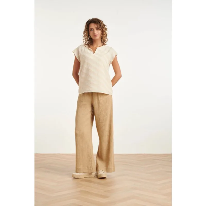 Zoek je een top die net even anders is? Deze Smashed Lemon top valt op door zijn unieke diagonale print en verfijnde textuur. De subtiele V-hals en de aangeknipte mouwtjes geven de top een minimalistische, maar zeer chique uitstraling. De zachte crèmetinten maken het een veelzijdig item dat prachtig staat op een nette pantalon of een casual jeans. De structuur in de stof geeft deze Smashed Lemon top extra karakter. Belangrijkste kenmerken : Subtiele V-hals voor een elegante en vrouwelijke uitstraling Unieke diagonale structuur print in zachte natuurtinten Korte, aangeknipte mouwen voor een minimalistisch designSpecificaties : * Stijl: Tops * Print: Strepen * Pasvorm: Losvallend * Lengte: Kort * Model is: 174cm tall and wears size S/36 * Country of origin:: Made in P.R.C. * Verkrijgbaar in kleuren: Zand - Donkerzand * Lining: 100% Viscose lining * Fabric composition: 65%cotton,35%linen
