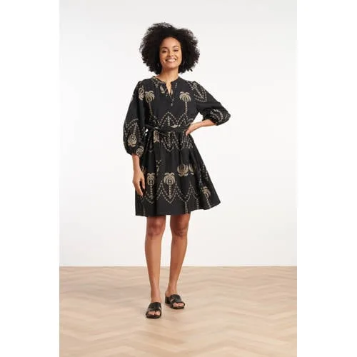 Voeg een tropische flair toe aan je garderobe met deze stijlvolle korte jurk van Smashed Lemon. De jurk heeft een elegante V-halslijn en driekwart mouwen, waardoor hij perfect is voor zowel casual als geklede gelegenheden. Het unieke ontwerp met een geborduurde palmboom print in zand op een zwarte achtergrond geeft de jurk een exotische, moderne uitstraling. De bijpassende ceintuur in de taille accentueert je figuur en zorgt voor een getailleerd effect. Deze jurk is een must-have voor de modebewuste vrouw die op zoek is naar een statement piece met een tropische twist. Kenmerken: - V-halslijn en driekwart mouwen voor een stijlvolle, vrouwelijke look - Geborduurde palmboom print in zand op een zwarte achtergrond voor een tropische uitstraling - Bijpassend ceintuur in de taille voor een getailleerd en flatterend effectSpecificaties : * Stijl: jurken * Print: Ornamental * Pasvorm: getailleerd * Lengte: Maxi * Model: 180 cm lang en draagt maat S/41 * Production country: Made