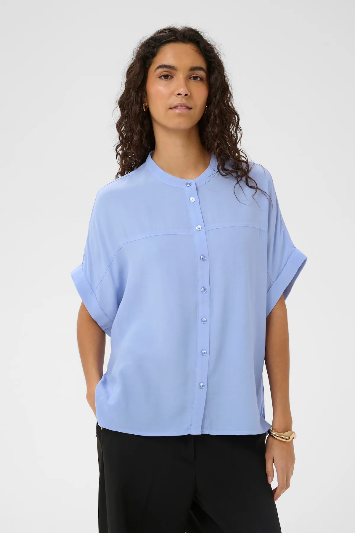 Deze blouse met korte mouwen heeft een losse pasvorm, gladde uitstraling, opstaande kraag, knopenrij en afgeronde zoom met langere achterzijde.