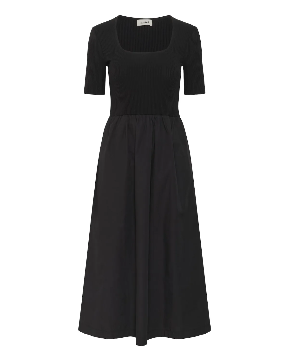 Zwarte jurk met een smock-bovenzijde en een vierkante halslijn. De geribbelde bovenkant biedt een nauwsluitende pasvorm, terwijl de rok gemakkelijk beweegt. Een nette en comfortabele favoriet voor de dagelijkse gang van zaken en speciale momenten.