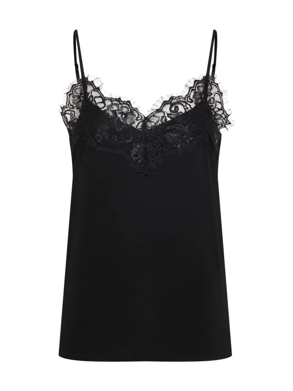 Blouse type: Blouseshirt; Design: Gevoerde zoom/rand; Materiaal: Viscose; Halstype: V-hals; Motief: Effen; Kraag: Zonder kraag; Soort bandjes: Spaghettibandjes; Details: Kant; Extra's: Verstelbare bandjes, Gladde stof, Voelt zacht aan; Pasvorm: Normale pasvorm; Armlengte: Mouwloos; Lengte: Normale lengte