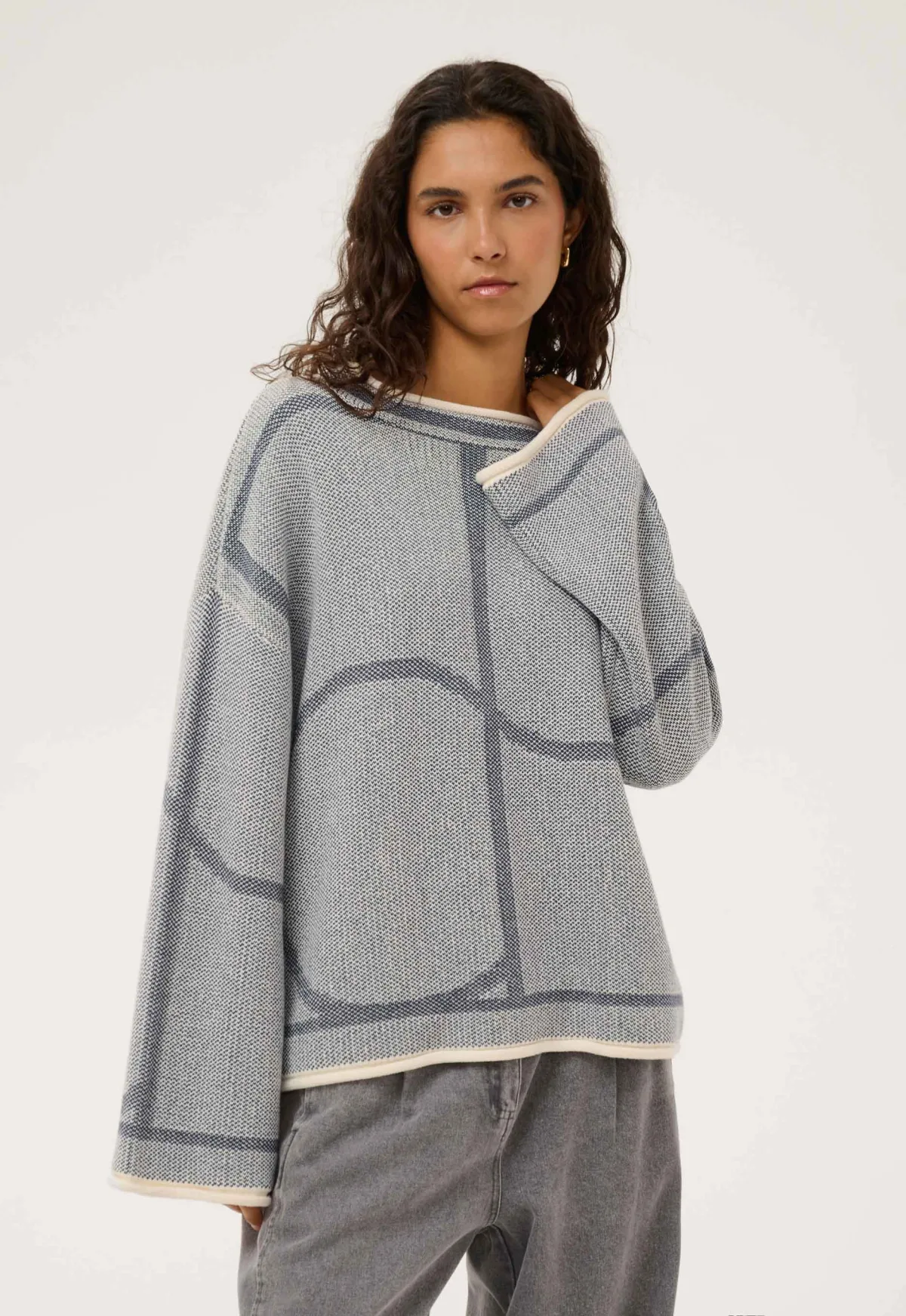 Dit is de 30409010 Rava Trui van het merk SOAKED. Deze trui heeft een oversized pasvorm en is gemaakt van 100% katoen, waardoor hij heerlijk zacht en comfortabel aanvoelt. Met zijn ronde hals en lange mouwen biedt deze trui een casual uitstraling die wordt versterkt door het structuurachtige uiterlijk en het abstracte lijnenspel over het hele ontwerp.