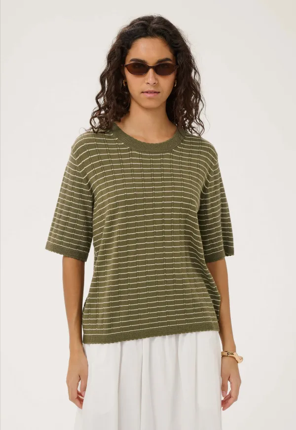 Dit is het 30409267 Spina Pullover T-shirt van het merk SOAKED. Deze T-shirt is uitgevoerd met een klassieke ronde hals en korte mouwen. De top is fijn gebreid en gemaakt van een mix van viscose lenzing ecovero, polyester en polyamide, wat zorgt voor een zachte touch en een verzorgde uitstraling.