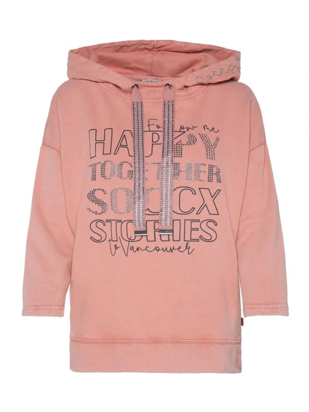 In een nieuwe look presenteert het capuchonsweatshirt voor dames van het merk SOCCX zich. Het heeft een casual used-kleur en 3/4 mouwen. Glitters worden gebruikt in de artwork op de voorkant en aan de capuchon. Het sweatshirt is super comfortabel om te dragen en zorgt voor een coole casual outfit.