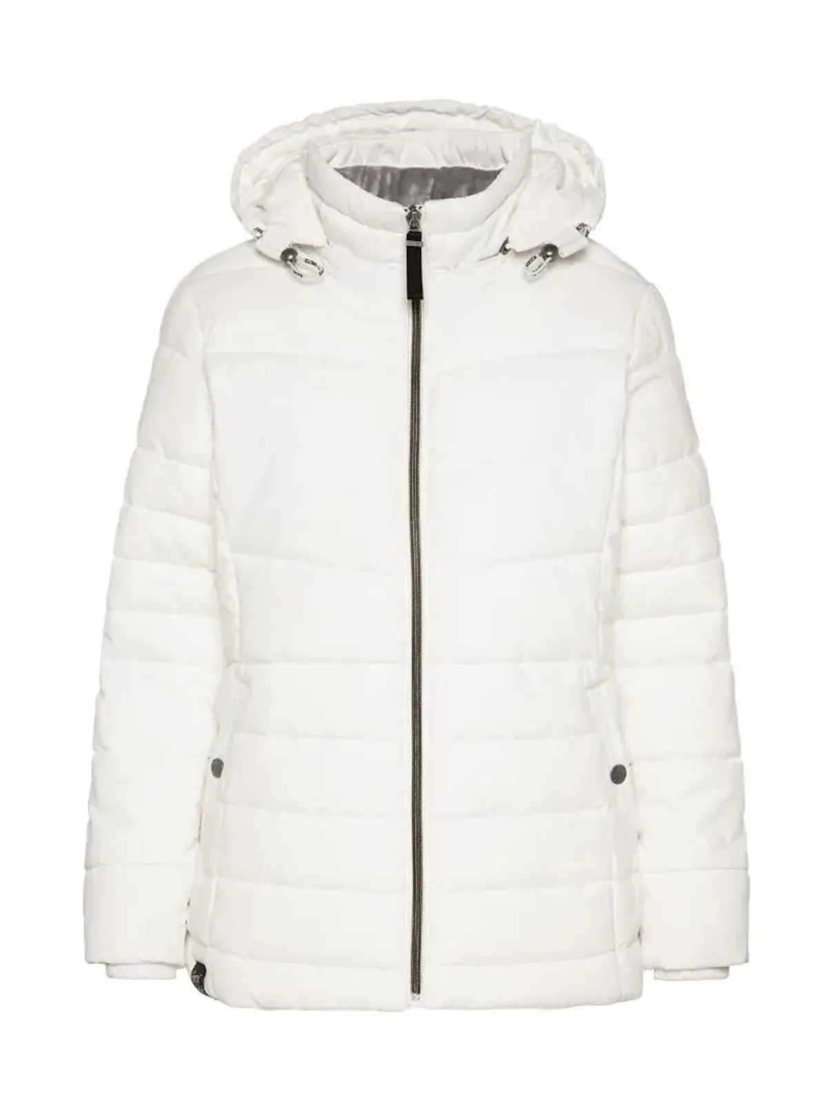 Deze gewatteerde jas voor dames is de ideale metgezel voor de winter. Hij is warm gevoerd en kan op verschillende manieren worden gecombineerd. De comfortabele snit creëert een vrouwelijk silhouet en is uiterst comfortabel om te dragen. De pluizige teddyvoering in de opstaande kraag en in het bovenste deel van de romp zorgt voor een behaaglijk gevoel. De jas kan worden gesloten met een rits. De capuchon kan met een trekkoord worden versteld of indien nodig worden verwijderd. Een opstaande kraag biedt extra bescherming tegen kou en wind. De mouwen zijn afgewerkt met geribde boorden om te voorkomen dat de kou binnendringt. De twee zijzakken met drukknopen zijn ideaal om kleine spullen in op te bergen of je handen warm te houden. Labelopdrukken op de capuchon en mouwen ronden het ontwerp af. Een stijlvolle winterlook is gegarandeerd met deze jas.