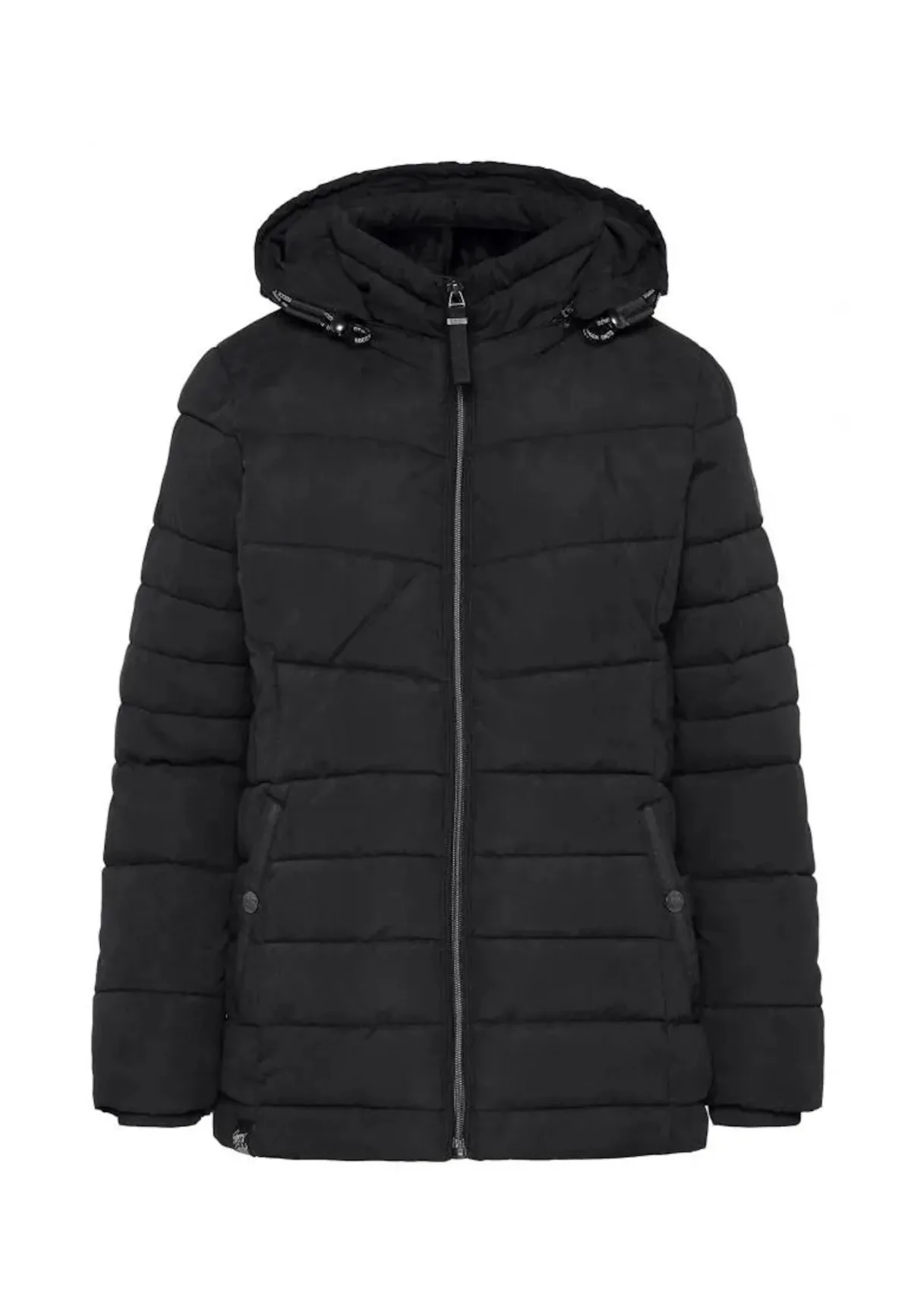 Dit gewatteerde damesjack is een ideale metgezel voor de winter. Het is warm gevoerd en kan op veel verschillende manieren gecombineerd worden. De comfortabele snit creëert een vrouwelijk silhouet en is uiterst comfortabel om te dragen. De donzige teddyvoering in de opstaande kraag en in het bovenlichaam zorgt voor een behaaglijk gevoel van welzijn. De jas sluit met een ritssluiting. De capuchon kan worden aangepast met een trekkoord of, indien nodig, worden gescheiden met een ritssluiting. Een opstaande kraag beschermt bovendien tegen kou en wind. De mouwen zijn voorzien van geribde manchetten om te voorkomen dat de kou binnendringt. In de twee zijzakken met drukknopen kunt u gemakkelijk kleine spullen opbergen of uw handen opwarmen. Labelprints op de capuchon en mouwen maken het ontwerp compleet. Met deze jas is een stijlvolle winterlook gegarandeerd.
