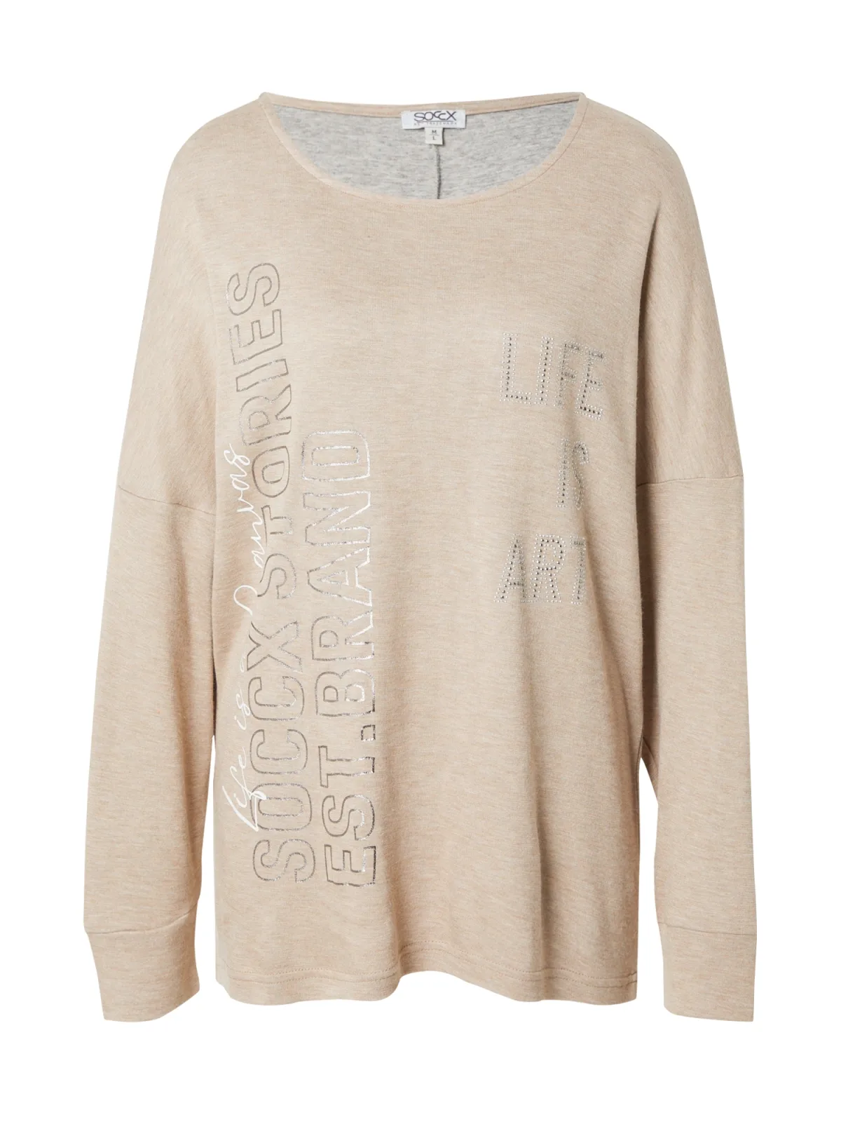 Design: Gevoerde zoom/rand, Rechte zoom, Overcut schouder; Materiaal: Jersey; Halstype: Boothals; Motief: Tekst print; Details: Sierstenen; Extra's: Op staal naden, Fijne stof; Pasvorm: Normale pasvorm; Armlengte: Lange mouw; Lengte: Normale lengte