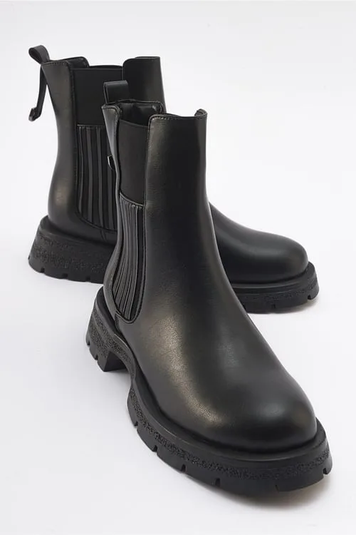Een minimalistische Chelsea boot met een strak kunstleren bovendeel en een comfortabele blokhak, ontworpen voor veelzijdige styling.
