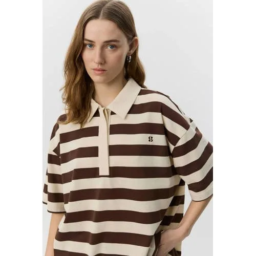 Deze katoenen dames polo van Sofie Schnoor geeft je outfit een sportieve en tegelijk verfijnde uitstraling. De bruine/ecru streep combineert rustig met de rest van je garderobe en voelt meteen zomers aan. Dankzij de polokraag en korte mouwen oogt het shirt casual, terwijl de subtiele logodetails zorgen voor een verzorgde afwerking. Gemaakt van 100% katoen, waardoor de stof zacht en ademend is op warme dagen.Details die het verschil maken Gemaakt van 100% katoen, voelt zacht aan op de huid Kort mouwmodel, ideaal voor het zomer seizoen Polokraag zonder sluiting voor een relaxed silhouet Bruin/ecru streepdessin met logo voor een sportieve look Valt binnen de 'Sporty Classic' trend, makkelijk te stylen Onderdeel van de Studio collectie van Sofie SchnoorCasual styling voor elke dagDit shirt is een fijne basis voor je dagelijkse looks. Combineer de polo met een lichte jeans of een korte broek voor een ontspannen dag, of draag het op een rechte pantalon voor een iets gekledere uitstraling. De soepele katoenen stof maakt het een comfortabel shirt om de hele dag te dragen, of je nu onderweg bent of thuis werkt.Sofie Schnoor: Scandinavische stijl met een twistSofie Schnoor staat bekend om ontwerpen die vrouwelijkheid en comfort op een moderne manier samenbrengen. De collecties hebben een Scandinavische uitstraling, met aandacht voor draagbare kleuren en doordachte details. Deze polo past daar precies in, met een ontwerp dat er verzorgd uitziet en prettig aanvoelt in het dagelijks leven.Een stijlvolle basic waar je zomer na zomer op terugvalt.