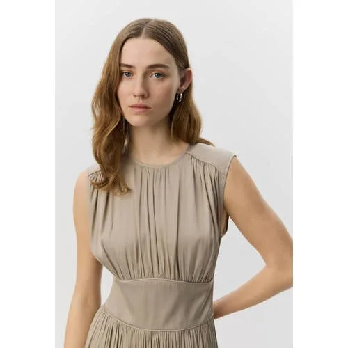 Deze elegante maxi jurk voor dames van Sofie Schnoor valt lang en zwierig, ideaal voor zomerse gelegenheden waar je graag wat extra uitstraling wilt. De effen beige kleur geeft een rustige, chique basis, terwijl de plooien zorgen voor een mooie beweging bij iedere stap. De jurk heeft een ronde hals en is mouwloos, waardoor de bovenkant luchtig en verfijnd oogt. De soepele stof voelt licht aan op de huid, prettig tijdens warme dagen en avonden.Verfijnde details voor speciale momenten Lange maxi lengte voor een gracieuze, vloeiende look Mouwloos ontwerp, prettig voor zomerse temperaturen Ronde halslijn die de hals subtiel accentueert Plooien over de lengte geven extra soepelheid en beweging Effen beige kleur, makkelijk te combineren met sieraden en hakken Blinde ritssluiting aan de achterkant voor een strak en rustig silhouet Zonder zakken, zodat de pasvorm mooi slank blijftPerfect voor bruiloften en feestelijke avondenDeze jurk komt goed tot zijn recht als je te gast bent op een bruiloft of een andere feestelijke gelegenheid. Combineer met sandalen met hak en verfijnde sieraden voor een geklede look, of met platte sandalen en een kleine schoudertas voor een meer ontspannen, maar nog steeds feestelijke uitstraling.Sofie Schnoor: Scandinavische stijl met een vrouwelijke twistSofie Schnoor staat bekend om eigentijdse collecties met een verfijnde, vrouwelijke uitstraling. De ontwerpen combineren een moderne pasvorm met doordachte details, waardoor je kledingstuk niet alleen mooi oogt, maar ook prettig draagt. Met deze jurk haal je een stijlvol item in huis dat past bij diverse zomerse gelegenheden.Een tijdloze keuze waarmee je tijdens elke feestelijke dag ontspannen en verzorgd voor de dag komt.