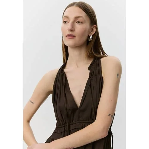 Deze bruine maxi jurk voor dames van Sofie Schnoor is een geschikte keuze voor zomerse gelegenheden. De langvallende rok, mouwloze snit en V-hals geven een open, luchtige uitstraling, terwijl de effen bruine kleur rustig oogt. Dankzij de striksluiting in de taille ontstaat een getailleerde vorm die zich makkelijk aanpast aan jouw silhouet.Details die het verschil maken Lange maxi jurk, ideaal voor warme dagen en feestelijke momenten Mouwloos ontwerp met rechte schouderlijn voor een moderne look V-hals die subtiel het decolleté accentueert Striksluiting in de taille voor een verstelbare pasvorm Effen bruine kleur die rustig oogt en makkelijk te combineren is Geen zakken voor een gladde, sierlijke lijn langs het lichaam Uit de Studio collectie van Sofie Schnoor, met aandacht voor detailsZomerse jurk voor bruiloft en feestDeze lange zomerjurk is geschikt als outfit voor een bruiloftsgast, een diner of een ander feestelijk moment. Met sandalen en een subtiele tas ontstaat een verzorgde look, en met een hak en opvallende sieraden krijgt de jurk een meer uitgesproken uitstraling.Sofie Schnoor: Scandinavische stijlSofie Schnoor staat bekend om vrouwelijke ontwerpen met een moderne, Scandinavische uitstraling. De collecties combineren draagbaarheid met doordachte details, zodat de kleding prettig zit en netjes oogt. Met deze jurk haal je een kledingstuk in huis dat je seizoen na seizoen kunt blijven dragen.Een lange, zomerse jurk met een rustige uitstraling waar je in verschillende situaties plezier van hebt.
