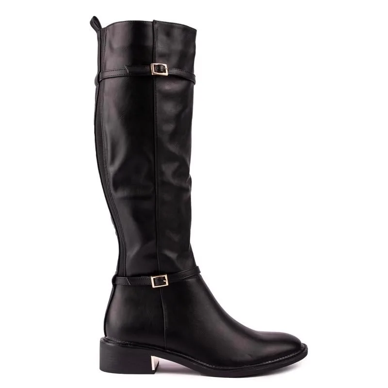 Deze fijne kniehoge Chloe Rijlaars van Solesister combineert klassieke ruiterstijl met de laatste trends. Gemaakt van soepel. Bovenwerk in leerlook. met een rekbaar rugdetail voor een ideale pasvorm. deze zelfverzekerd. stijlvolle designerlaarzen hebben een strakke zool met een slimme metalen hielversiering en elegante bandjes met goud. delicate gespen. wat een verfijnd tintje toevoegt aan deze rijstijl.