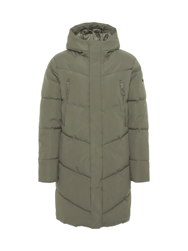 Type mantel: Gewatteerde jas; Design: Met capuchon, Verborgen rits, Rits zak, Zakken aan de zijkant; Type sluiting: Ritssluiting; Voering: Warm gevoerd; Motief: Effen; Extra's: Label patch/label flag, Stiksels, Op staal naden, Gladde stof; Pasvorm: Normale pasvorm; Lengte: Normale lengte