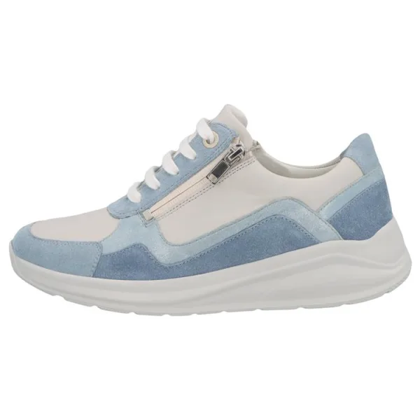 De Solidus 54512 in de kleur 80810 blauw/wit is dé perfecte dames veterschoen voor wie op zoek is naar extra breedte, ondersteuning en modern comfort. Deze sportieve comfortsneaker combineert een frisse blauw-witte uitstraling met de hoogwaardige afwerking waar Solidus om bekendstaat.Het bovenwerk is vervaardigd van soepel leer dat zich comfortabel naar de voet vormt. De combinatie van verschillende blauwtinten met wit geeft deze schoen een eigentijdse, frisse look die perfect past bij een casual outfit of sportieve vrijetijdslook.Dubbele breedtemaat: H én KWat deze Solidus dames sneaker bijzonder maakt, is de aanpasbare wijdtemaat. De schoen wordt geleverd met een extra binnenzool onder de standaard zool:Laat u de extra zool zitten? Dan draagt u de schoen in wijdte H (breed).Haalt u de extra zool eruit? Dan ontstaat er wijdte K (extra breed).Hierdoor is deze schoen uitermate geschikt voor dames met bredere voeten, hallux valgus of andere voetklachten waarbij extra ruimte gewenst is.Daarnaast beschikt de schoen over een uitneembaar voetbed, waardoor hij perfect te dragen is met eigen steunzolen. De combinatie van veters en een praktische ritssluiting zorgt voor een optimale pasvorm en extra gebruiksgemak.Solidus: specialist in comfort en pasvormSolidus staat bekend als comfortmerk met focus op ergonomie, ondersteuning en hoogwaardige materialen. De schoenen worden ontworpen met extra aandacht voor stabiliteit, demping en drukverdeling. Ideaal voor vrouwen die veel lopen of behoefte hebben aan extra ondersteuning zonder concessies te doen aan stijl.De lichtgewicht zool met goede demping en grip maakt deze dames comfortsneaker geschikt voor dagelijks gebruik, lange wandelingen of een actieve dag.