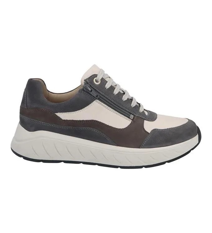 Deze Solidus Ken veterschoen (artikelnummer 71122 21037) voor heren is een toonbeeld van functionele elegantie en orthopedisch comfort. Uitgevoerd in een stijlvolle combinatie van diverse grijstinten en wit leer, biedt deze sneaker een moderne look voor de kwaliteitsbewuste wandelaar.Hier zijn de belangrijkste kenmerken van dit model: Design & GebruiksgemakHoogwaardige Materialen: De schoen is opgebouwd uit een mix van soepel glad leer en nubuck in harmonieuze tinten grijs, wit en donkerbruin.Dubbele Sluiting: Naast de klassieke vetersluiting is de schoen voorzien van een praktische ritssluiting aan de buitenzijde, wat het aan- en uittrekken aanzienlijk vergemakkelijkt.Ademend Interieur: De binnenzijde is volledig gevoerd met leer voor een optimaal voetklimaat en een zacht gevoel.Zool & PasvormCloud Step Technologie: De opvallende witte tussenzool is voorzien van de 'Cloud Step' technologie, wat zorgt voor een vederlichte tred en superieure schokabsorptie.Optimale Grip: De zwarte rubberen loopzool heeft een anatomisch profiel dat de natuurlijke afwikkeling van de voet ondersteunt en stabiliteit biedt op diverse ondergronden.Wijdte H-K: Dit model is specifiek ontworpen voor de bredere voet (wijdte H tot K), waardoor er extra ruimte is bij de voorvoet en wreef zonder in te leveren op de stevige hielsluiting. Orthopedisch voordeel: Het voetbed is volledig uitneembaar, waardoor deze schoen bij uitstek geschikt is voor het dragen van eigen op maat gemaakte steunzolen.