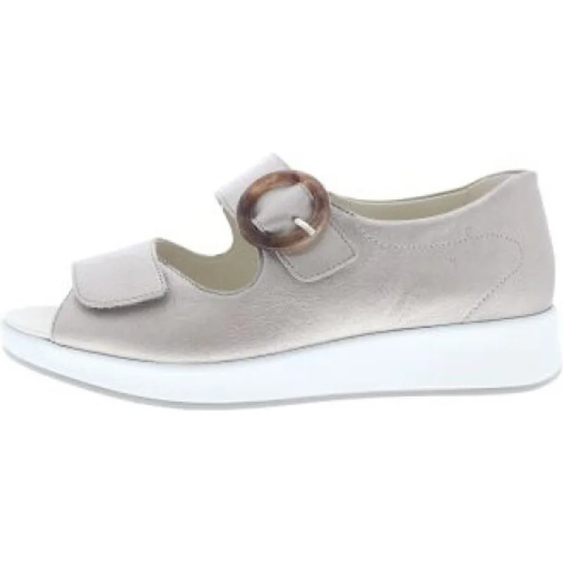 Solidus dames sandaal, model Hannah. Klittenbansluiting met sier gesp en een stevig gesloten contrefort. De doorlopende zool geeft een stevige middenvoet ondersteuning, terwijl je geniet van een anatomisch gevormde voetbed, dat tevens met klittenband vast zit en uitneembaar is voor een eigen steunzool. Beige glad leer met metallic afwerking. Wijdte H, geschikt voor de iets bredere voet. Hakhoogte 35mm. Hielheffing 15mm.