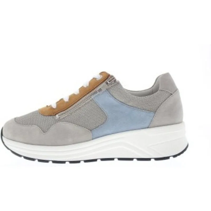 Solidus dames sneaker, model Karma. Dit is een profylaxe uitvoering zonder voelbare stiknaden, geschikt bij diabetische en reumatische voetklachten. Uitgerust met een stevige afwikkelzool en een behoorlijke torsiestijfheid. Het brede draagvlak in combinatie met de sterke contrefort zorgen voor veel stabiliteit. Ideale schoen bij een hallux valgus vanwege een royalere balwijdte en toegeknepen hielslot, terwijl de hielheffing je voetwortel centreert. Complete casual schoen waar je makkelijk lange afstanden mee maakt voor je stedelijke wandeling, winkelen of bij het doen van je boodschappen. Grijs met blauw suède gecombineerd met mesh. Wijdte K, geschikt voor de brede voet. De rits is functioneel. Uitneembaar voetbed. Hakhoogte 45mm. Hielheffing 30mm.