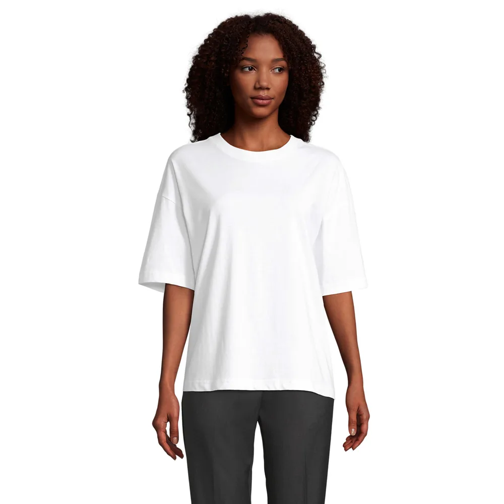 100% organisch gekamd katoen. Stof: Jersey. Ontwerp: Eenvoudig. Halslijn: Crew Neck, Ribbed. Mouwtype: Korte mouwen. Dropshoulder, zijnaden. Pasvorm: Boxy Oversized. 180gsm. Duurzaamheid: Oeko-Tex Standaard 100 gecertificeerd, Biologisch katoen, Veganistisch. XS: 34,5 in. S: 37 in. M: 39,5 in. L: 41,5 in. XL: 44 in.
