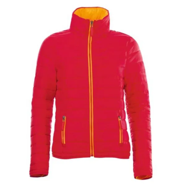 Polyester watten. Nylon voering. Waterafstotend. Aangepaste stijl. Contrasterende voering en ritssluitingen. Kraag hoog voorritsbaar. Opstaande kraag. Twee zakken met rits aan de voorkant. Zelfkleurige band op manchetten en zoom. Materiaal: Nylon buitenkant. Damesmaat: S- 10, M- 12, L- 14, XL-16, XXL- 18.