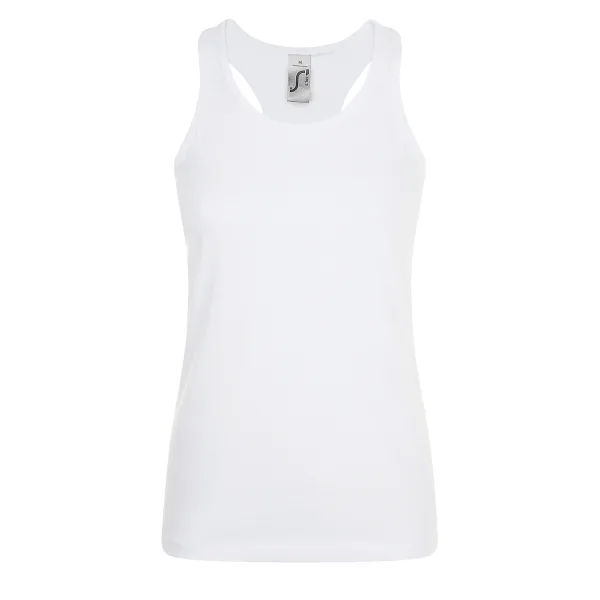 Damesvest. Damespasvorm. Ribbinding aan nek- en armsgaten. Racer back stijl. Buislichaam. Zoom met dubbele naald. 150 g/m². Stof: 100% Semi-Combed Ringspun Katoen. Dames Borstomvang: XS: 6/8 UK, S: 8/10 UK, M: 10/12 UK, L: 12/14 UK, XL: 14/16 UK, XXL: 16/18 UK.