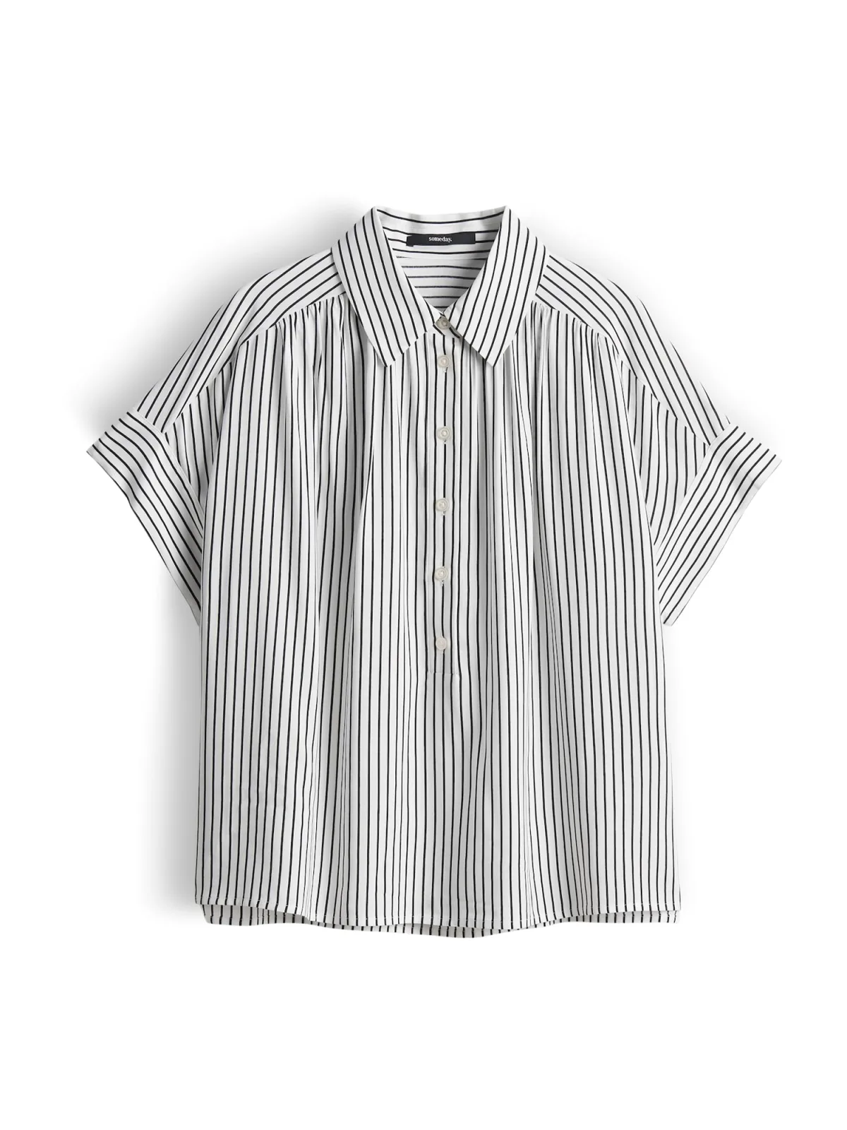 Blouse type: Wijde blouse; Design: Overcut schouder, Turn-down kraag; Type sluiting: Knoopsluiting; Materiaal: Viscose; Motief: Gestreept; Kraag: Cut-away boord; Details: Plooien, Gedrapeerd; Extra's: All-over patroon, Voelt zacht aan; Pasvorm: Losse pasvorm; Armlengte: Kwartmouw; Lengte: Normale lengte