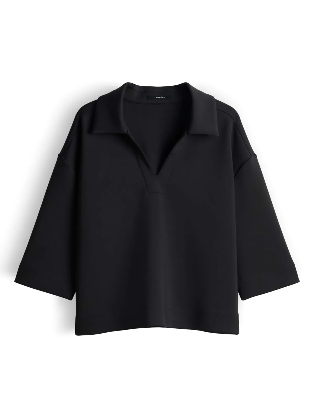 Blouse type: Wijde blouse; Design: Gevoerde zoom/rand, Recht model, Overcut schouder; Materiaal: Sweatstof; Halstype: Polokraag; Motief: Effen; Extra’s: Op staal naden, Voelt zacht aan; Pasvorm: Losse pasvorm; Armlengte: Driekwart mouw; Lengte: Normale lengte