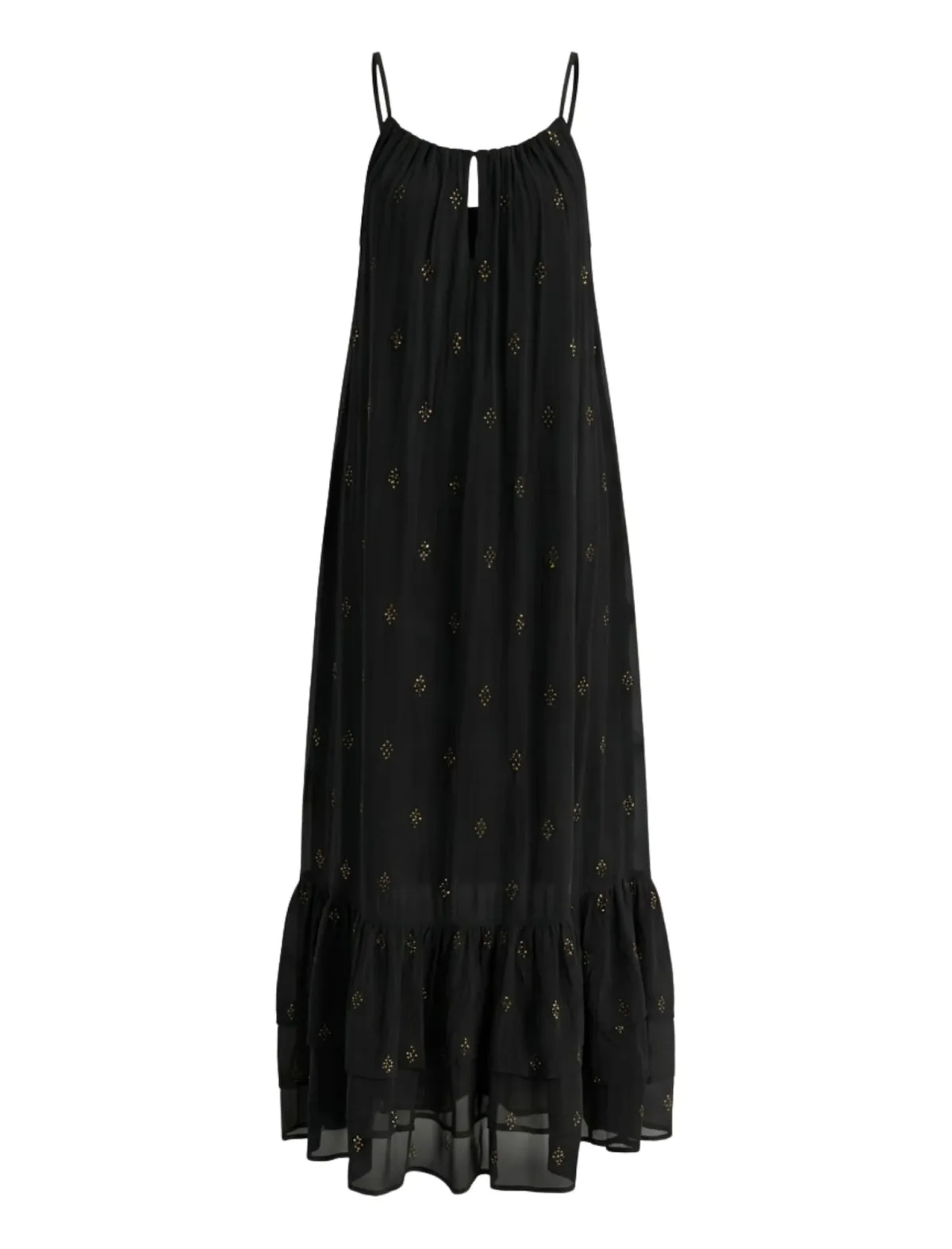 Design: Om te knopen/binden; Materiaal: Viscose; Halstype: Ronde hals; Soort bandjes: Spaghettibandjes; Details: Cut-outs, Pailletten, Borduursels, Volant, Gedrapeerd; Extra's: Lichte stof; Lengte: Lang/maxi; Snit: Uitlopend; Pasvorm: Losse pasvorm; Armlengte: Mouwloos