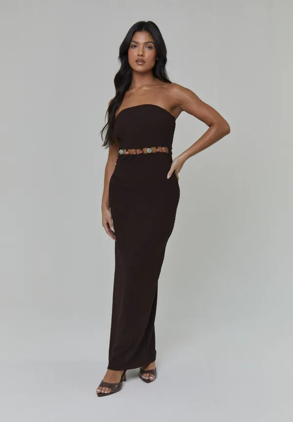Design: Split; Halstype: Carréhals; Motief: Effen; Soort bandjes: Bandeau; Details: Cut-outs; Extra's: Met textuur; Lengte: Lang/maxi; Snit: Figuur omarmend; Pasvorm: Slanke pasvorm; Armlengte: Mouwloos