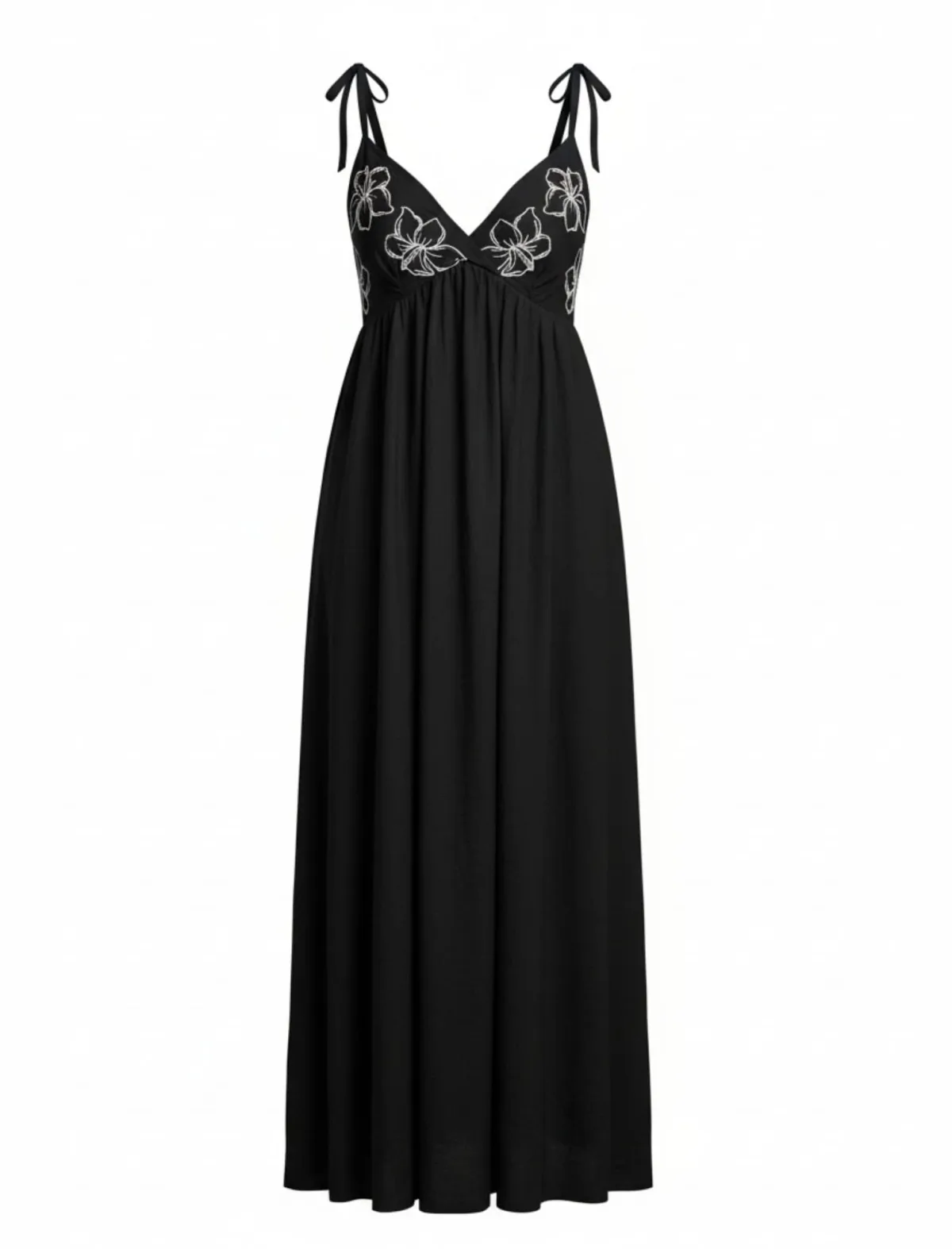 Design: Gevoerde zoom/rand, Rechte zoom, Om te knopen/binden; Materiaal: Katoen; Halstype: V-hals; Motief: Bloemenprint; Soort bandjes: Spaghettibandjes; Details: Borduursels, Gedrapeerd; Extra's: Op staal naden, Voelt zacht aan; Lengte: Lang/maxi; Snit: Uitlopend; Pasvorm: Normale pasvorm; Armlengte: Mouwloos