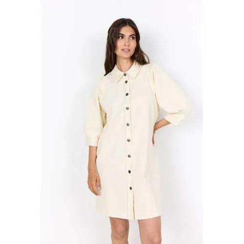 De kortere lengte, luchtige stof en subtiele details maken deze Soyaconcept denim jurk tot een praktische dagelijkse basis voor het voorjaar. De ecru kleur oogt fris en licht, terwijl de blousevorm met klassieke kraag zorgt voor een verzorgde uitstraling. Door het rechtvallende model voelt de jurk niet strak aan en valt hij soepel langs je lichaam.Verfijnde blousejurk met denim uitstraling Rechtvallende pasvorm die mooi langs het lichaam valt zonder te tekenen Effen ecru kleur die rustig oogt en makkelijk te combineren is Klassieke kraag en drukknoopsluiting voor een nette, blouseachtige look Driekwart pofmouwen voor een subtiel accent en extra bewegingsvrijheid Kort model, ideaal voor lente en warme dagen Gemaakt van katoen met een klein beetje stretch voor een soepele touch Blousejurk en spijkerjurk in één door de denim uitstralingCasual en gekleed in één jurkDeze jurk is geschikt voor veel momenten op de dag. Draag hem casual met sneakers op een vrije dag of met sandaaltjes naar een etentje. De effen kleur maakt het eenvoudig om accessoires toe te voegen, zoals een tas in een contrastkleur of subtiele sieraden.Soyaconcept: toegankelijke stijl voor elke dagSoyaconcept staat bekend om kleding die trends volgt, maar toch makkelijk draagbaar blijft. De collecties zijn ontworpen met aandacht voor pasvorm en comfort, zodat je je de hele dag prettig voelt in wat je draagt. Met deze jurk kies je voor een kledingstuk dat goed te combineren is en past in een moderne garderobe.Een lichte jurk waarmee je eenvoudig een verzorgde, dagelijkse look creëert.