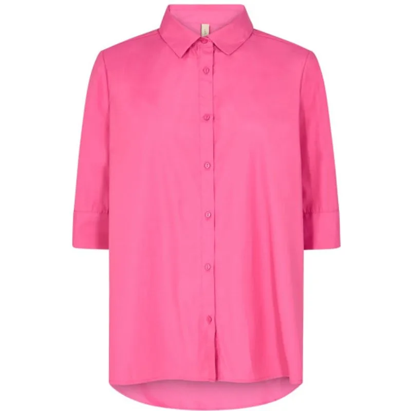Deze fuchsia blouse van het merk Soyaconcept is de perfecte toevoeging aan jouw kledingcollectie. Met zijn opvallende kleur en stijlvolle design is deze blouse een echte eyecatcher. De blouse heeft driekwart mouwen en sluit met knoopjes aan de voorkant. De plooitjes bij de mouwen zorgen voor een speels effect. Aan de voorkant is de blouse iets korter dan aan de achterkant, wat zorgt voor een flatterende pasvorm. Het materiaal van deze blouse bestaat voor 53% uit gerecycled polyester en 47% uit katoen, wat niet alleen goed is voor het milieu maar ook zorgt voor een fijn draagcomfort. Combineer deze blouse met een mooie jeans en hakken voor een stijlvolle look, of draag hem met een rok en sneakers voor een meer casual outfit. Met deze blouse van Nummer Zestien ben jij helemaal klaar voor elke gelegenheid!