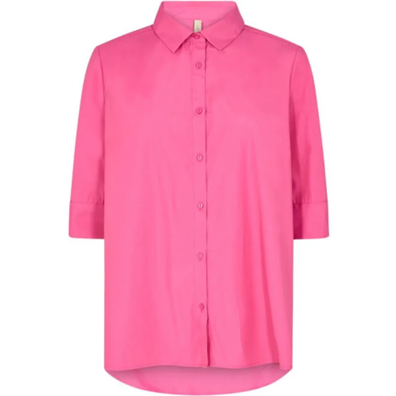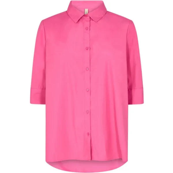 Deze fuchsia blouse van het merk Soyaconcept is de perfecte toevoeging aan jouw kledingcollectie. Met zijn opvallende kleur en stijlvolle design is deze blouse een echte eyecatcher. De blouse heeft driekwart mouwen en sluit met knoopjes aan de voorkant. De plooitjes bij de mouwen zorgen voor een speels effect. Aan de voorkant is de blouse iets korter dan aan de achterkant, wat zorgt voor een flatterende pasvorm. Het materiaal van deze blouse bestaat voor 53% uit gerecycled polyester en 47% uit katoen, wat niet alleen goed is voor het milieu maar ook zorgt voor een fijn draagcomfort. Combineer deze blouse met een mooie jeans en hakken voor een stijlvolle look, of draag hem met een rok en sneakers voor een meer casual outfit. Met deze blouse van Nummer Zestien ben jij helemaal klaar voor elke gelegenheid!