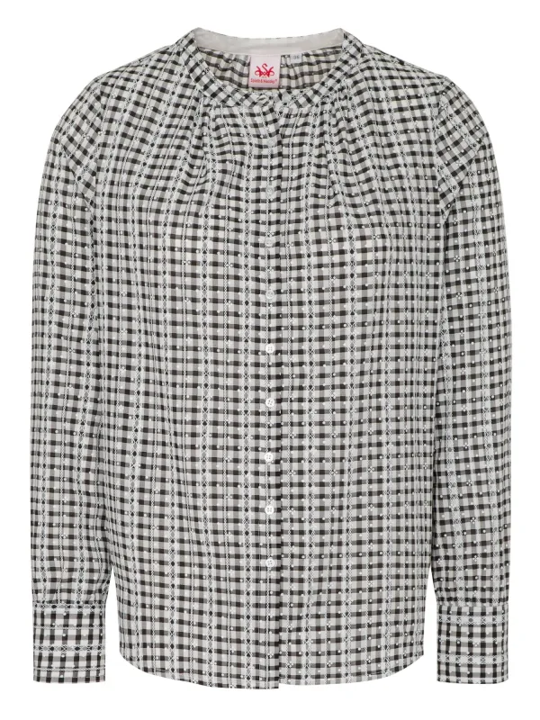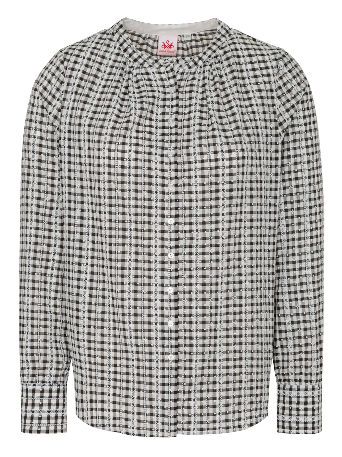 Blouse type: Klassieke blouse; Design: Knop placket, Mouwen met knopen; Type sluiting: Knoopsluiting; Materiaal: Katoen; Kraag: Zonder kraag; Details: Gedrapeerd; Extra's: All-over patroon; Pasvorm: Normale pasvorm; Armlengte: Lange mouw; Lengte: Normale lengte