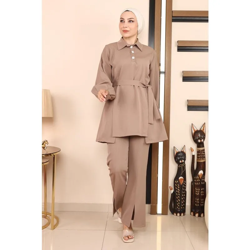 Stofkenmerk: Gemaakt van dubbele stof. Productkenmerk: Nieuwe seizoen hijab modeproduct en niet gevoerd. De tuniek heeft functionele halve knopen aan de voorkant. Het heeft een voorkantssplit. De riem is verwijderbaar. De broek heeft een elastische taille. De benen zijn gesplit. De productkleur kan afwijken door conceptfoto's. Het model draagt maat 38. Maat 38 Tuniek Afmetingen: Productlengte: 83 cm - Borst: 118 cm - Taille: 104 cm - Heupen: 114 cm Maat 38 Broek Afmetingen: Productlengte: 98 cm - Taille: 80 cm - Heupen: 92 cm Maatafmetingen nemen toe met 3 of 4 cm. (Productlengte verandert niet)