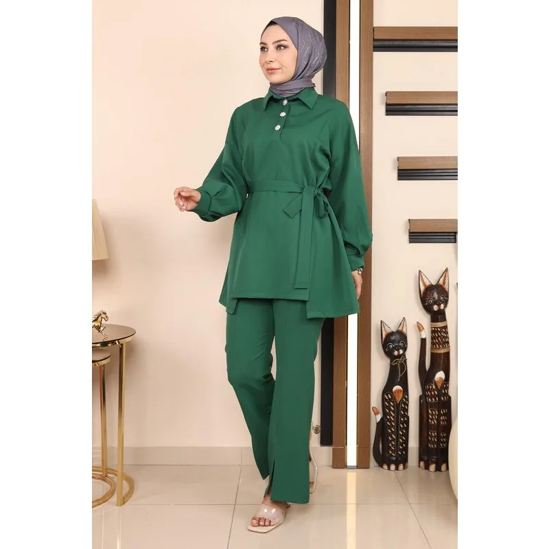 Stofkenmerk: Gemaakt van dubbele stof. Productkenmerk: Nieuwe seizoen hijab modeproduct en niet gevoerd. De tuniek heeft bruikbare halvemouwen knopen aan de voorkant. Het heeft een split aan de voorkant. De riem is verwijderbaar. De broek heeft een elastische taille. De pijpen zijn gesplit. De productkleur kan verschillen door conceptfoto's. Het model draagt maat 38. Maat 38 Tuniekmetingen: Productlengte: 83 cm - Buste: 118 cm - Taille: 104 cm - Heupen: 114 cm Maat 38 Broekmetingen: Productlengte: 98 cm - Taille: 80 cm - Heupen: 92 cm Maatmetingen verhogen met 3 of 4 cm. (Productlengte verandert niet)