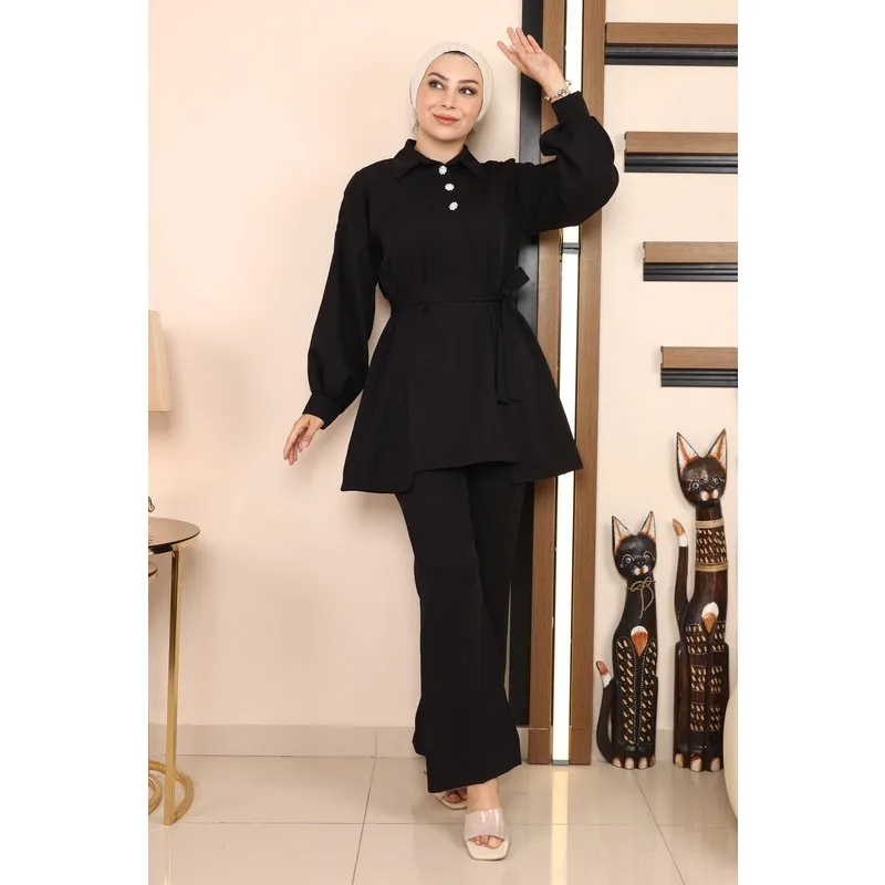 Stofkenmerk: Gemaakt van dubbele stof. Productkenmerk: Nieuw seizoens hijab modeproduct en niet gevoerd. De tuniek heeft functionele halve knopen aan de voorkant. Het heeft een split aan de voorkant. De riem is verwijderbaar. De broek heeft een elastische taille. De pijpen hebben een split. De productkleur kan verschillen door conceptfoto's. Het model draagt maat 38. Maat 38 Tuniek Afmetingen: Productlengte: 83 cm - Borst: 118 cm - Taille: 104 cm - Heupen: 114 cm Maat 38 Broek Afmetingen: Productlengte: 98 cm - Taille: 80 cm - Heupen: 92 cm Maatafmetingen verhogen met 3 of 4 cm. (Productlengte verandert niet)